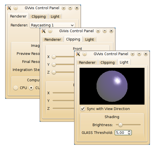 The design concept of the new GUI is oriented towards "interactive" manipulation of the rendering settings, which means that it is assumed that the rendering process is quite fast (less than a second up to ~ 5 seconds at max for high quality renderings). Historically, Vvis provided a number of different volume rendering algorithms to choose from (layered textures, raycasting and shear warp, with the first two even in multiple versions with various differences). Since raycasting is not only the fastest rendering algorithm implemented in Vvis (especially with CUDA support), but also produces the best-looking images, it was decided to focus the development work for Vvis 2012 entirely on the raycasting renderer. The result is that most of the improvements in the new version apply to the raycasting renderer only. It is now the recommended and "quasi-standard" renderer in Vvis. The other renderers should still work, in theory, but are not supported in the current version.